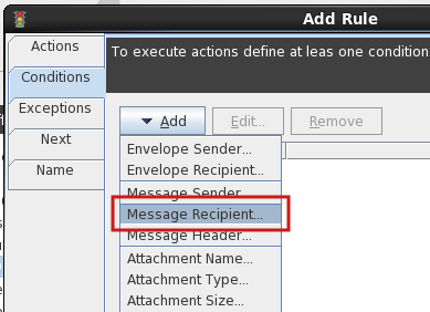 Now on the Conditions tab define a domain which should be blocked. For this example use *@gmail.com domain. Select Message Sender menu from the list.