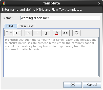 So, the most important thing is to create template which will be used as disclaimer. Editor can create Html and Text templates, they are used in messages in all formats. Compose editor support basic function to create html template, like: font family, font size, bold, italic, underline, text color and hyperlinks.