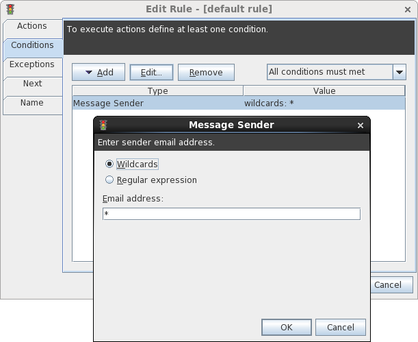 After that, we need to define conditions. I’ll use simple Message Sender requirement for this, but application provide a lot of different conditions and exceptions which can be used to determine if disclaimer should be appended or not.