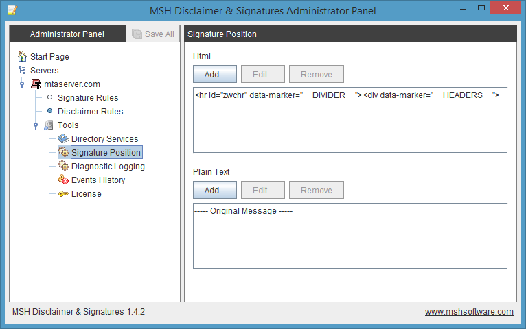 The MSH Disclaimer & Signatures application adds signatures and disclaimers to email messages as they are handled by the mail server.
