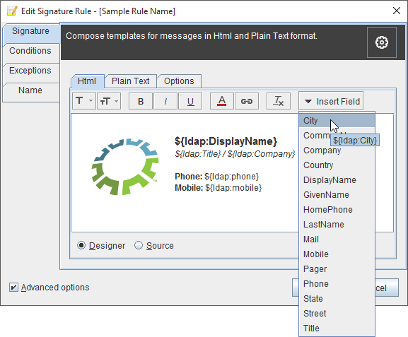 Signature template can contain dynamic fields which will be replaced with user data from directory service.