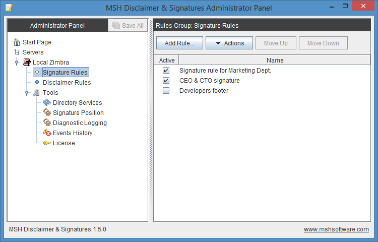 After installation and basic configuration IT administrator can connect with desktop application to the mail server. He will be able to create rules, define conditions and select signature templates which should be added into email messages.