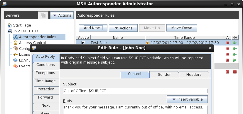 You have control over auto reply subject, body content and additional custom headers. Subject and body content support LDAP variables so each auto reply message can be personalized based on an auto reply sender.